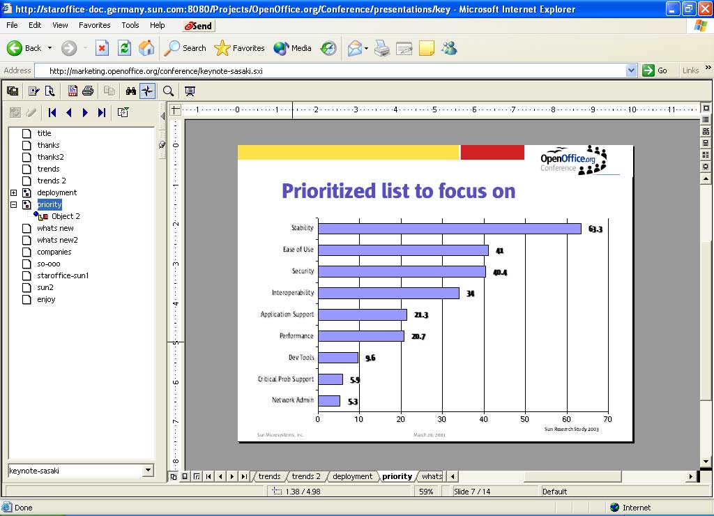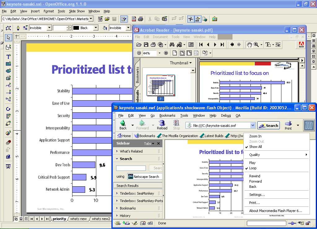 Grafik8 OpenOffice.org kann nun Präsentationen und Zeichnungen in das Macromedia Flash - Format (.swf) exportieren. Dadurch ist es nun möglich, Präsentationen in einem einfachen Web Browser zu betrachten, der das Flash Plugin installiert hat. Sowohl Empfänger als auch Nutzer von Flash - Präsentationen brauchen jetzt nicht mehr extra einen speziellen Viewer zu installieren, um eine Präsentation zu betrachten.