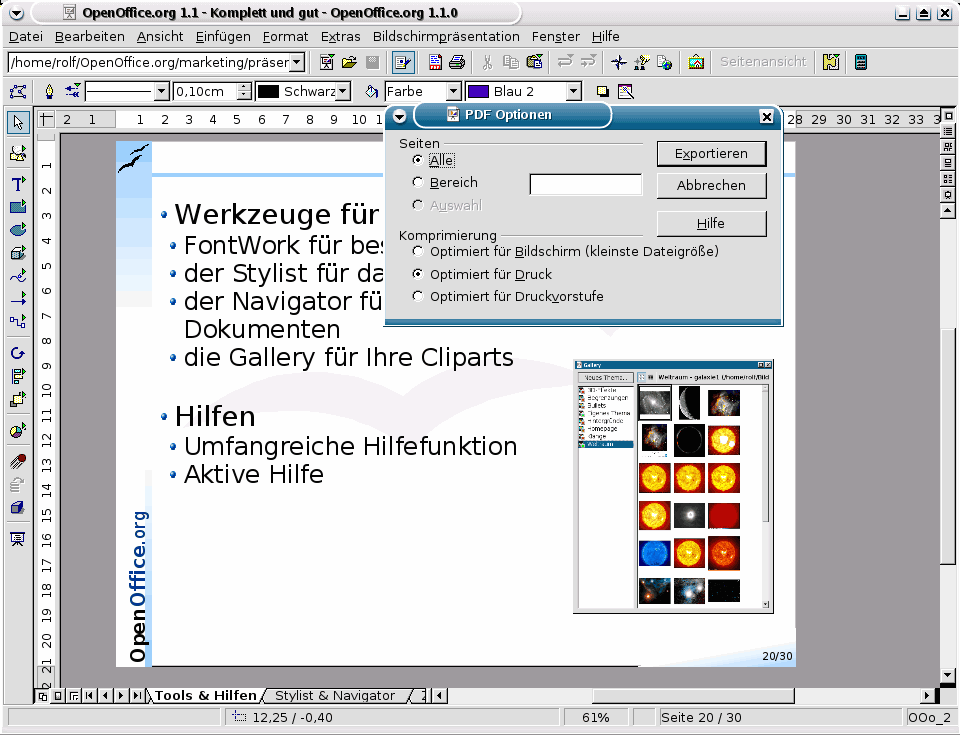 Grafik7 Mit OpenOffice.org 1.1 können Sie Ihre Dokumente mit nur einem Klick in PDF-Dateien umwandeln, ohne die Software eines weiteren Herstellers installieren zu müssen. Damit wird es kinderleicht, Dokumente in einem Standardformat für nicht änderbare Dokumente auszutauschen. Normalerweise wird für den Export von PDF-Dateien recht teure Zusatzsoftware benötigt. Mit OpenOffice.org erhalten Sie diese Möglichkeit gratis.